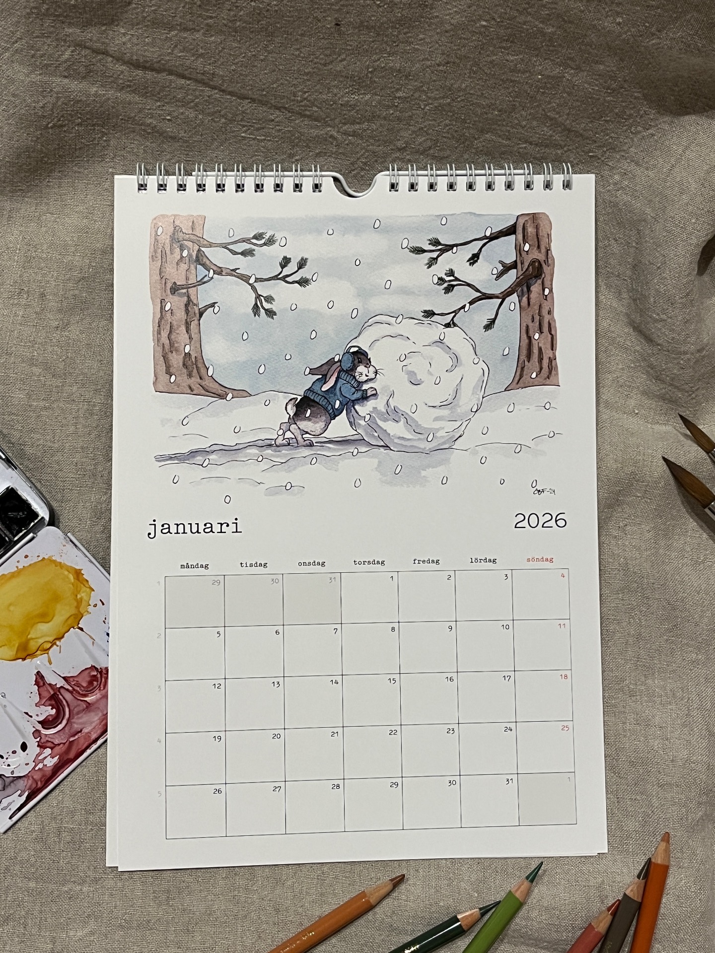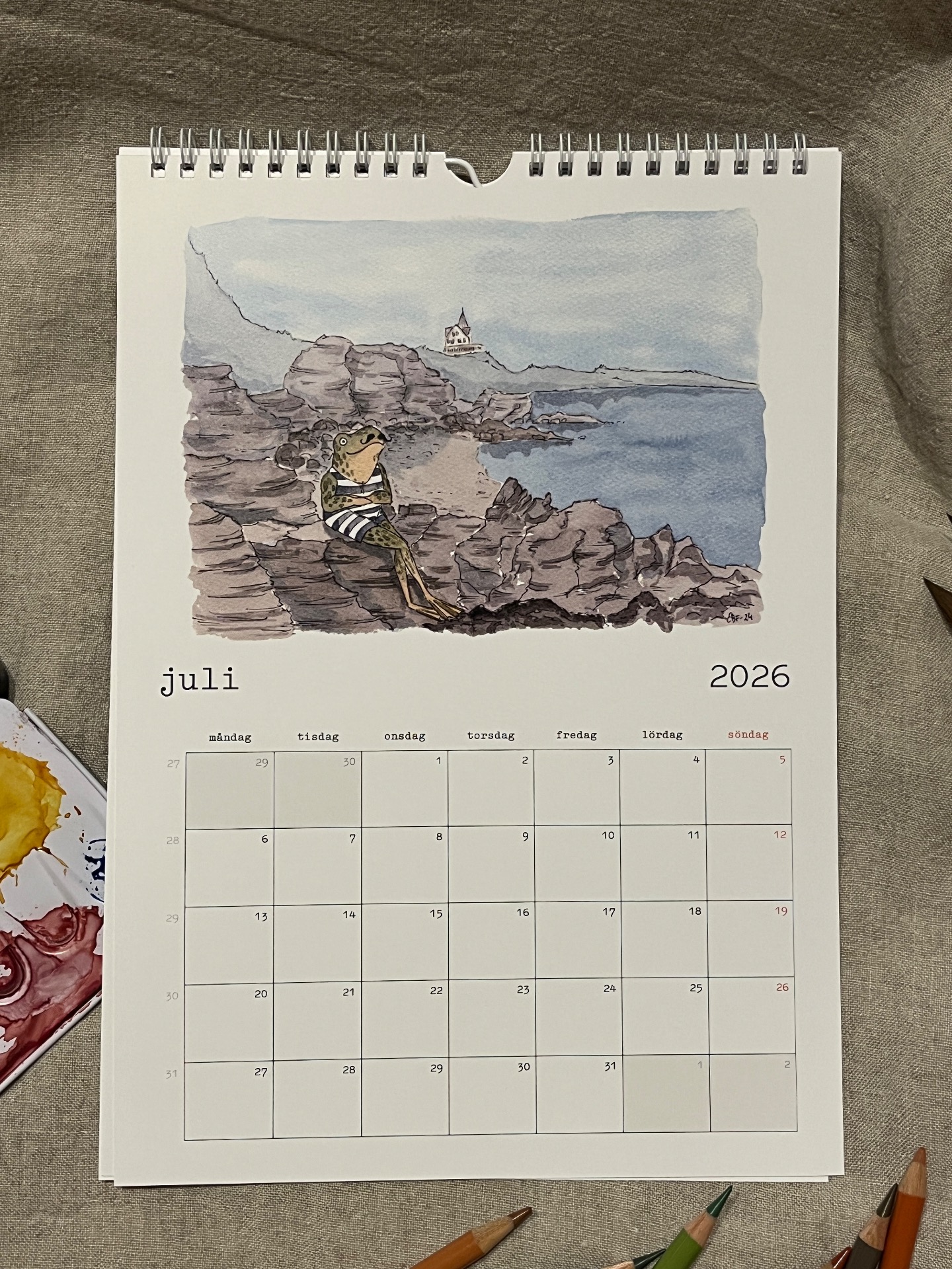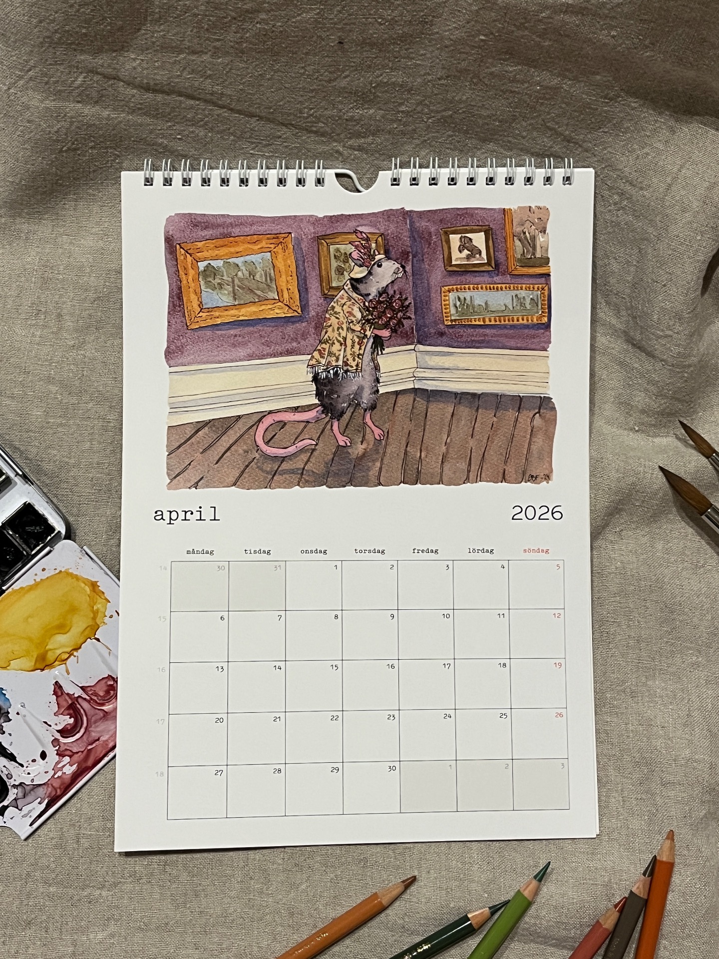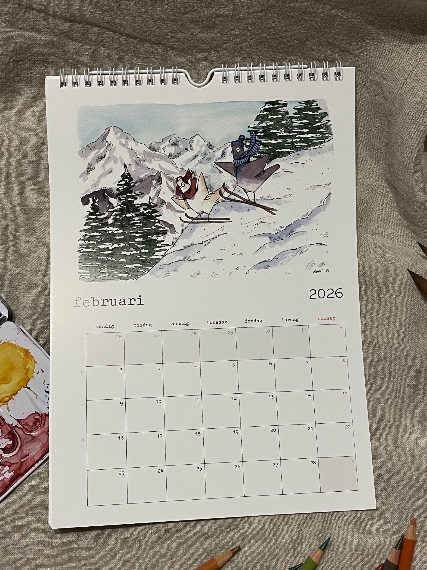 Spiralbunden väggalmanacka för 2026 med lekfulla och humoristiska illustrationer som man blir glad av!