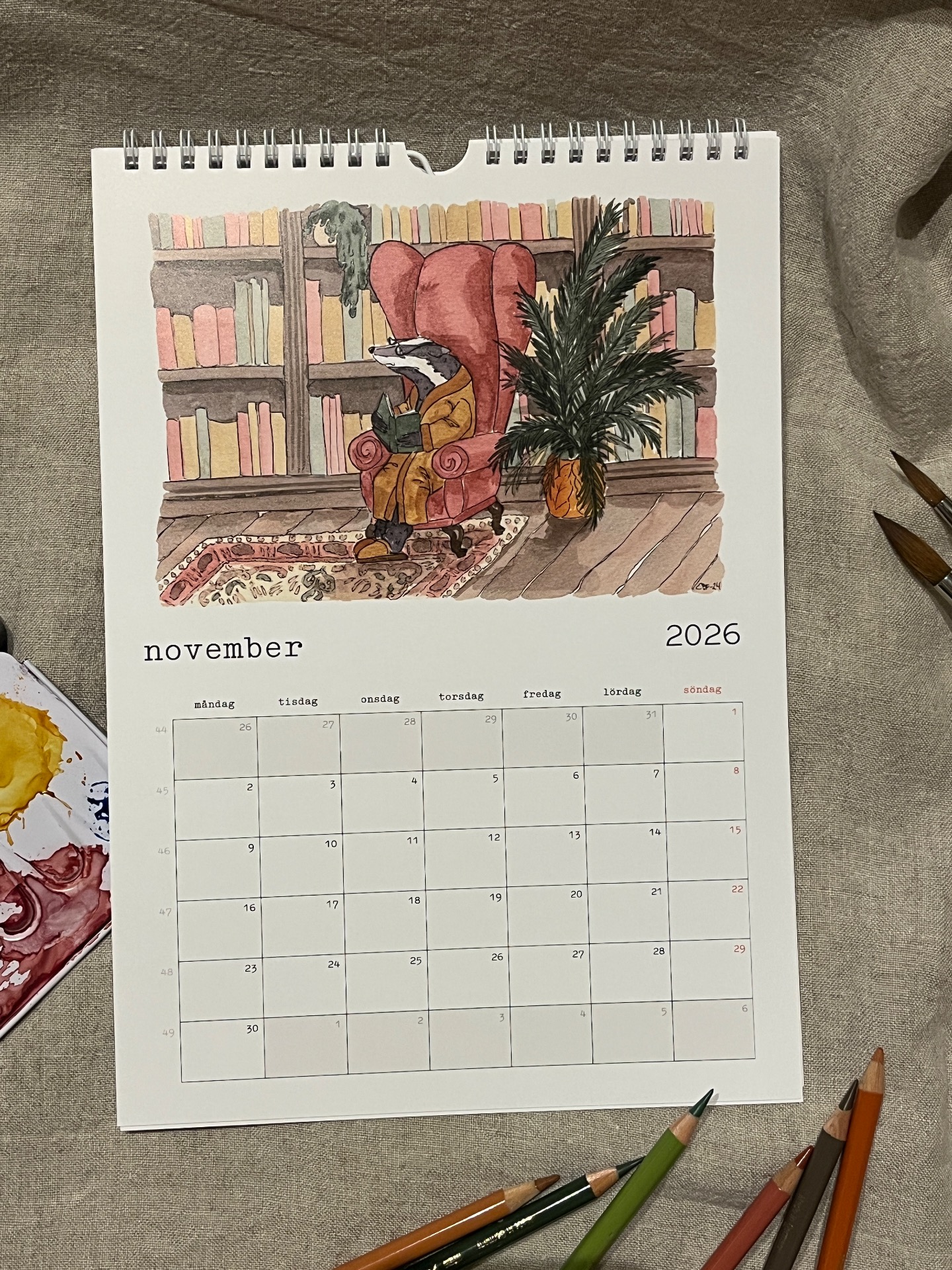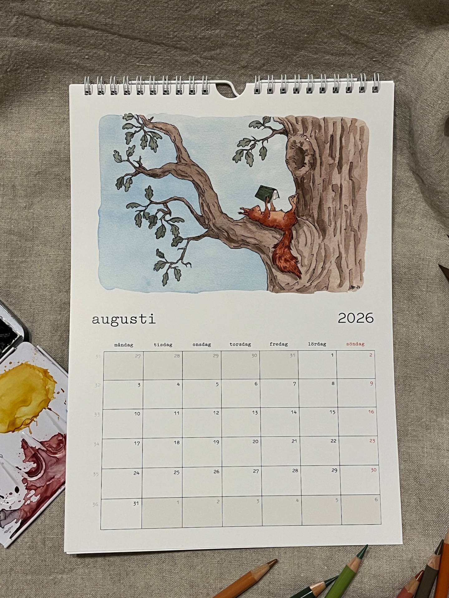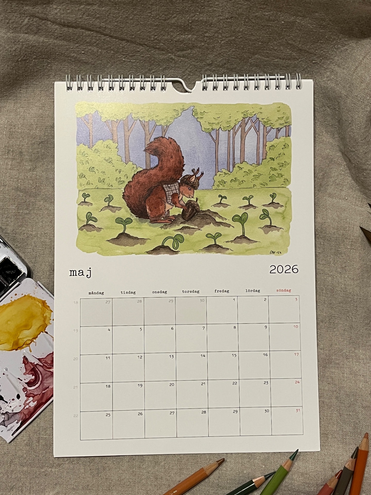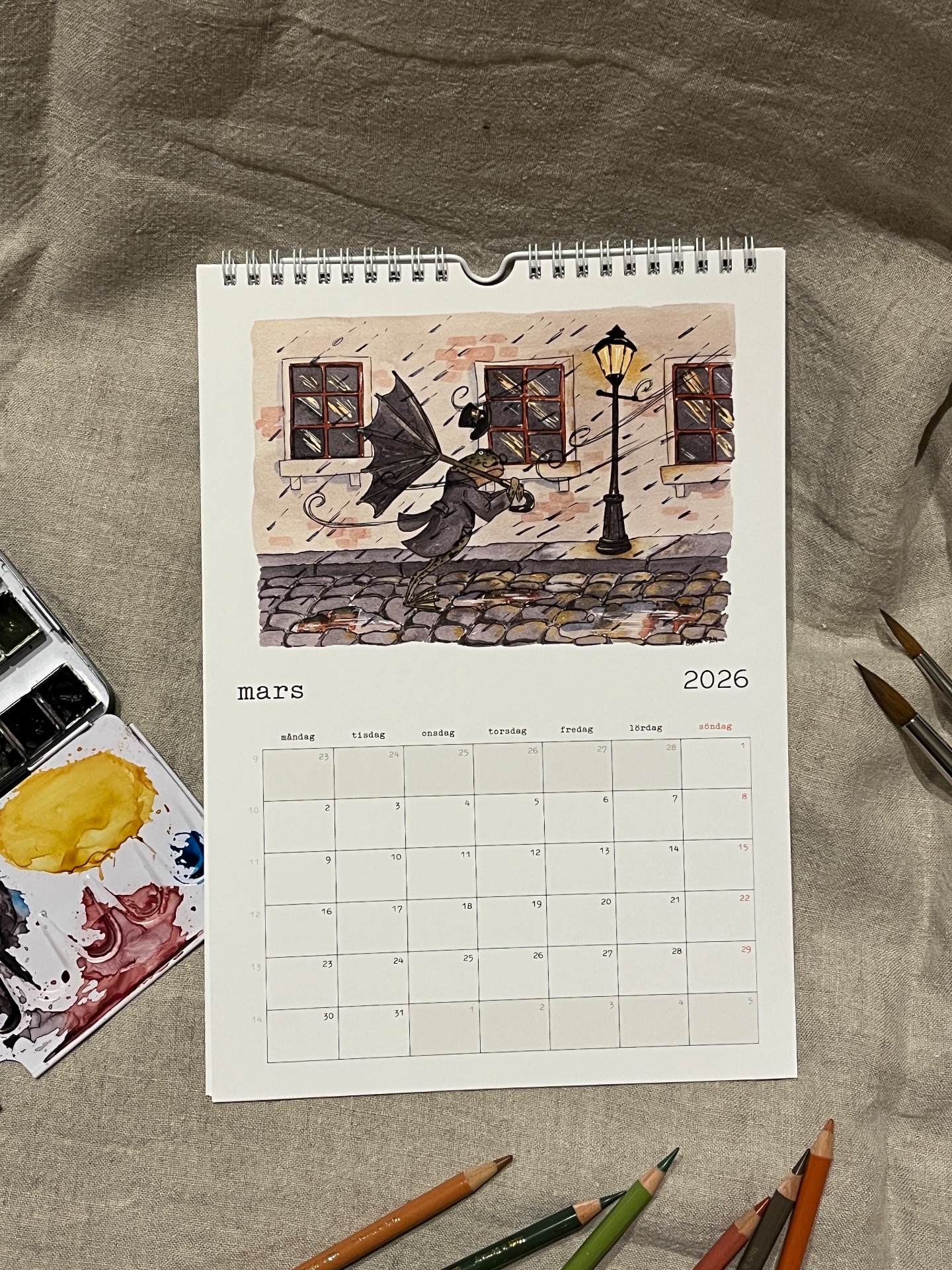 Spiralbunden väggalmanacka för 2026 med lekfulla och humoristiska illustrationer som man blir glad av!