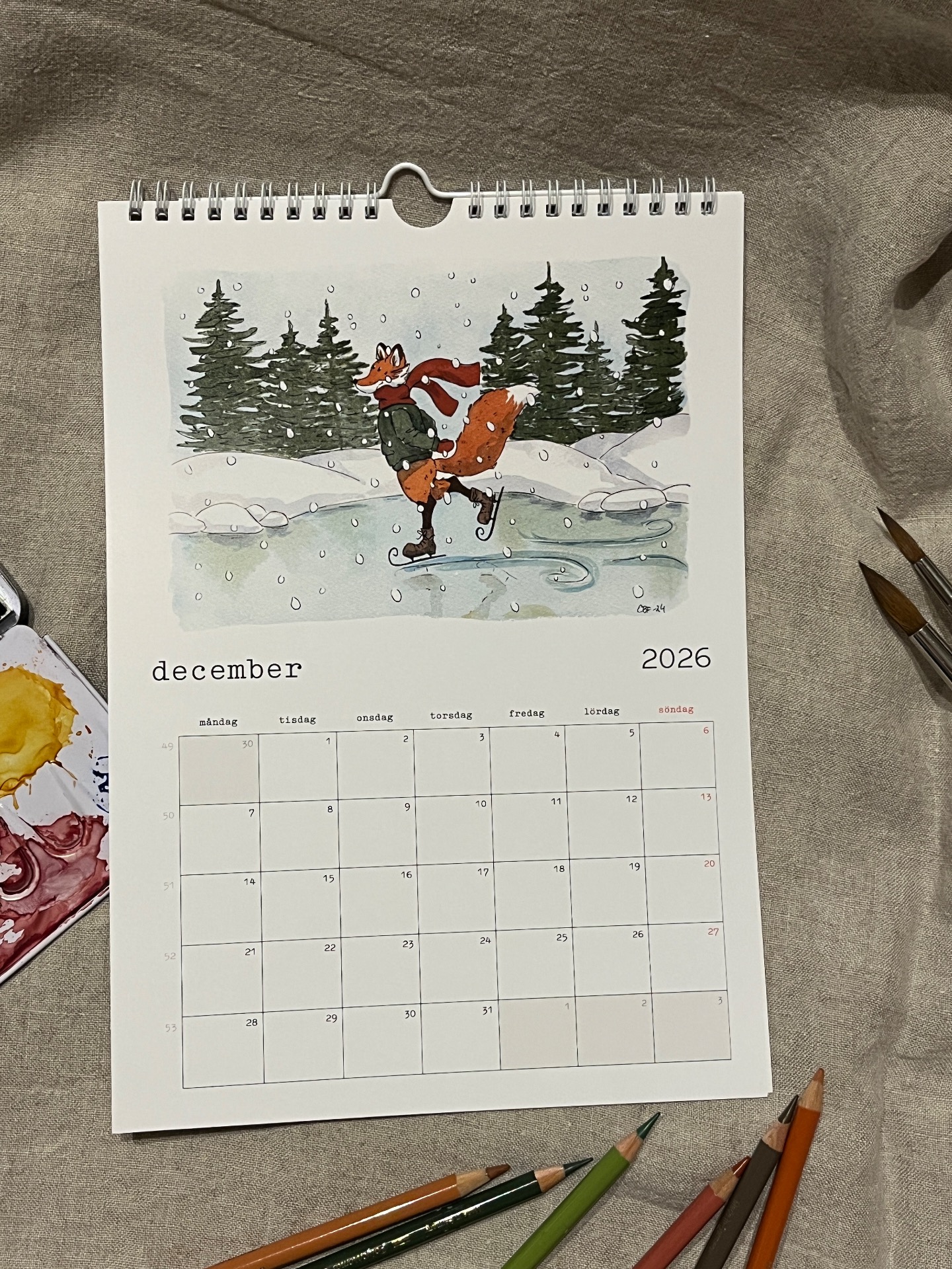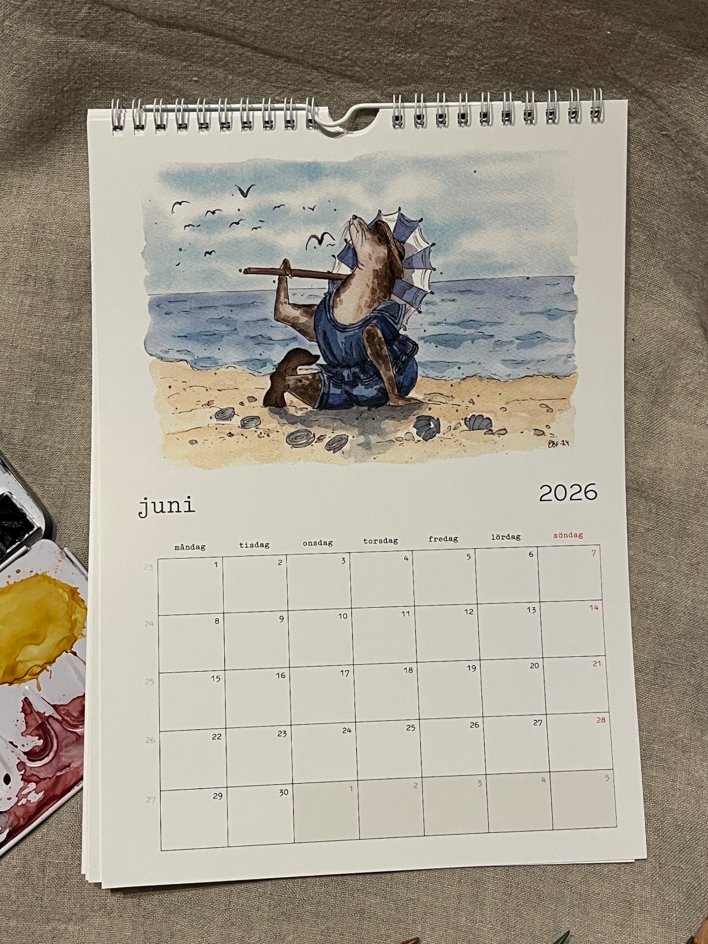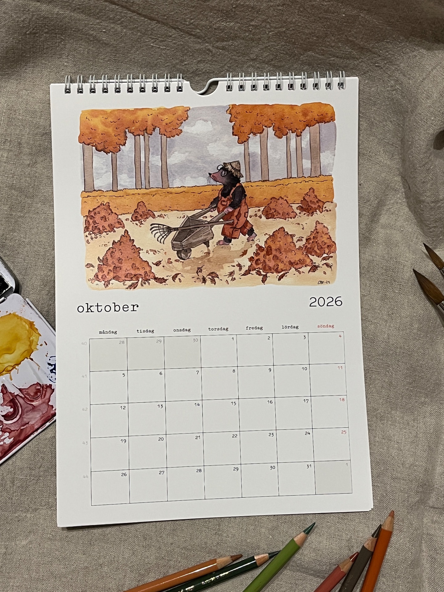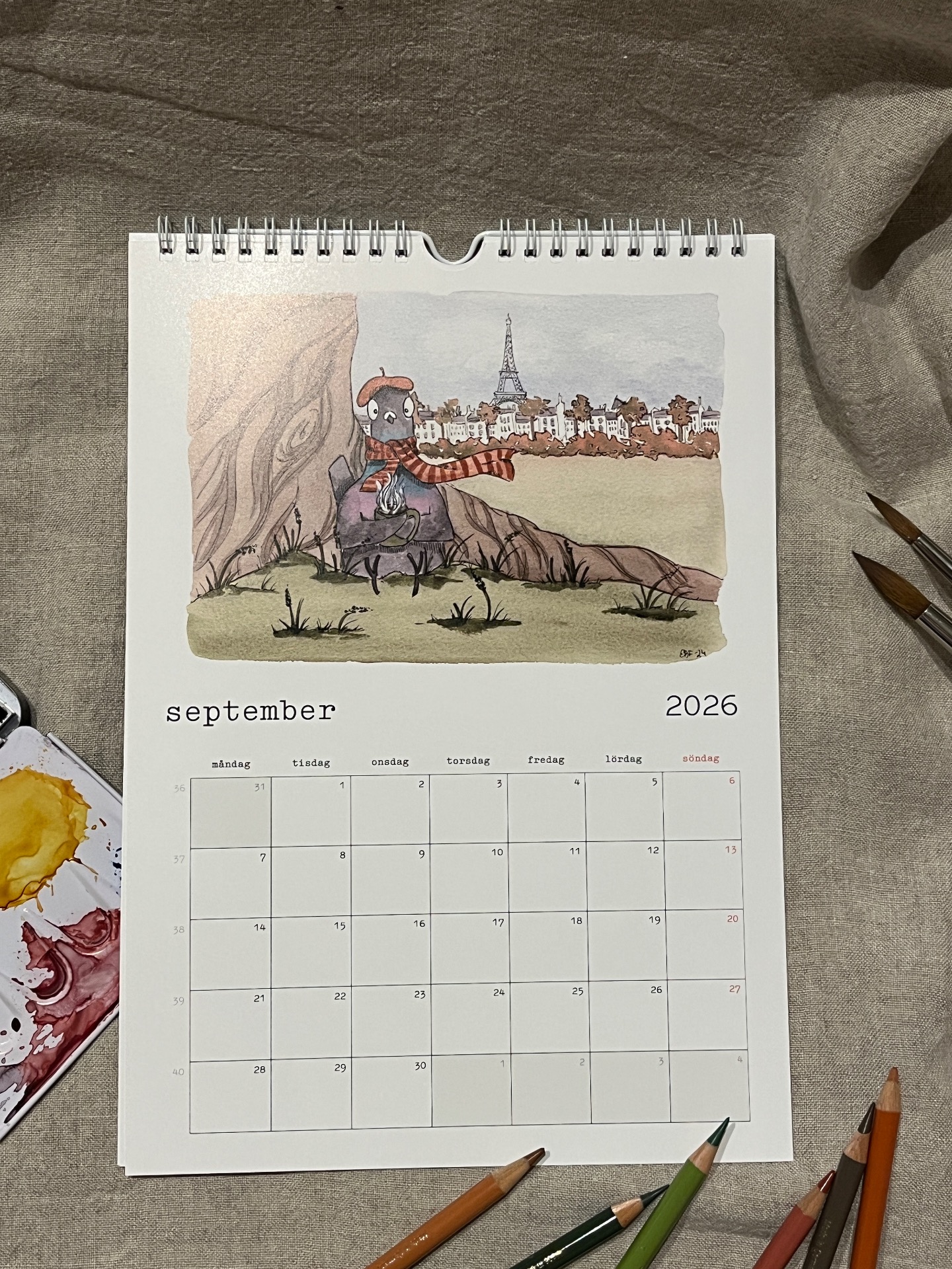 Spiralbunden väggalmanacka för 2026 med lekfulla och humoristiska illustrationer som man blir glad av!
